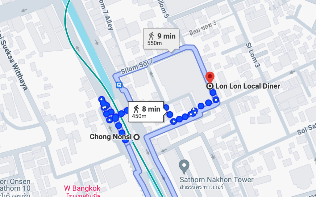 To reach Lon Lon, (In my opinion Bangkoks best Thai restaurants), take the BTS Skytrain and disembark at Chong Nonsi Station. From there, it’s a straightforward 450-meter walk to the restaurant.